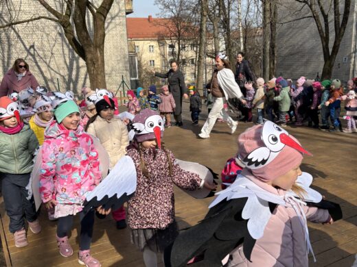 Į „Viltenės“ kiemą sugrįžę gandrai pakvietė vaikus pasidžiaugti bundančiu pavasariu. Jie kleketavo, plasnojo ilgais sparnais, vaikščiojo po pievą ir net mikliai gaudė...