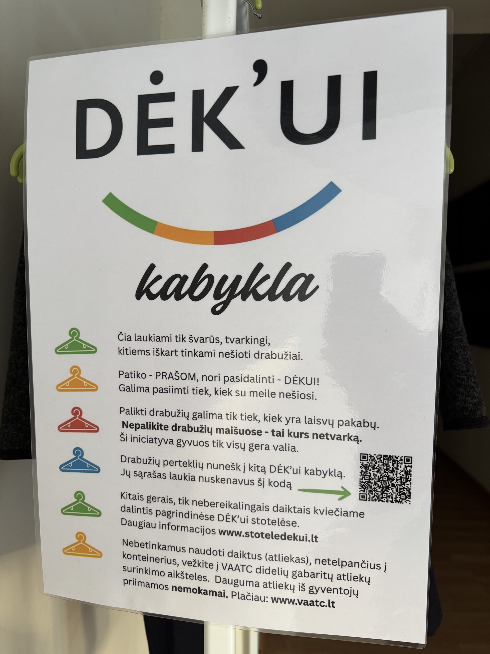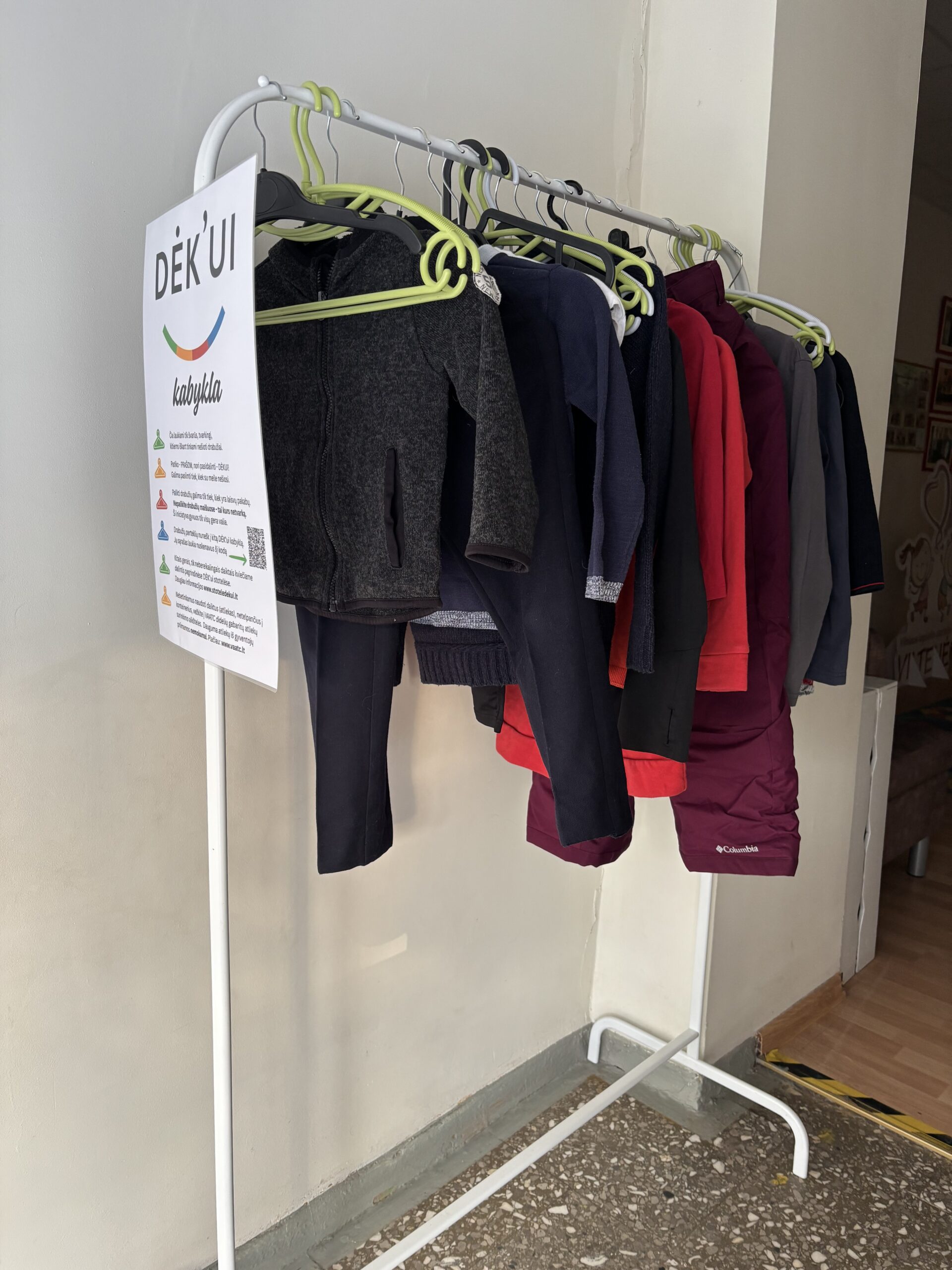 Prie darželio salės įkurta „Dėk’ui“ kabykla – jauki ir prasminga vieta, skirta išaugtiems vaikučių drabužėliams. Tai bendruomeniškumo ir tvarumo erdvė, kurioje daiktai randa antrą gyvenimą, o geri darbai – tęsiasi.